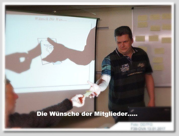 Mittels einer Präsentation stellte Matthias den Zeitplan und die einzelnen Arbeitsbereiche vor. Feste Termine wie Fieldday und Familien-Grillfest haben weiterhin ihren Bestand im Vereinsleben und Funkaktivitäten, Conteste, ARDF-Veranstaltungen, Notfunkaktivitäten, diverse Worshops, Antennenarbeiten und immer wieder Renovierungs- und Verschönerungsarbeiten sowie die regelmäßige Geländepflege, werden um diese festen Termine herum ausgeführt werden. Des Weiteren wurden Notizzettel verteilt und die Anwesenden konnten nach dem Motto "wünsch dir was" aufschreiben was ihrer Meinung nach außerdem wünschenswert wäre. Da kam einiges zusammen und Matthias und Daniel sortierten am Whiteboard die einzelnen Themen. Nachdem einige Wünsche, die in der Agenda bereits vorgestellt oder angedacht waren, aussortiert werden konnten, gab es genügend Gesprächsstoff bis 22:30h. Matthias nahm alle neuen Vorschläge auf und hat sie inzwischen in seinem