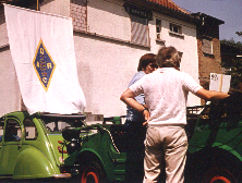 Aus Anlass des 10-jährigen Bestehens des Ortsverbandes wollten wir ein F39-Diplom entwerfen. Neben den Wettbewerbsbedingungen, die in Zusammenarbeit mit kompetenten OM unseres Vereins ausgearbeitet wurden, war es mir gelungen meinen langjährigen Stammtischfreund Frank zu überzeugen, dass ein solches Vorhaben einen art director erforderlich macht. Frank hatte schon meine QSL-Karte entworfen und die Sache war in guten Händen. Zunächst gab es einen schwarz-weiß-Entwurf, der sich an das Motiv der damaligen QSL-Karte anlehnte. Als alles fertig war hatte ich den Antrag beim DARC eingereicht. Er wurde abgelehnt, u.a. Weil er nicht mehrfarbig gestaltet war. Ich glaube mich zu erinnern, dass auch der kurze Zeitraum des Bestehens unseres OV für die Entscheidungsträger keinen Anlass zur Herausgabe eines Diploms darstellte. Aus Jux und Dollerei habe ich das Motiv später -wie sagte man früher beim Film?- nachcoloriert (mit nur einer Farbe!). Es blieb beim Versuch eines F39-Diploms.